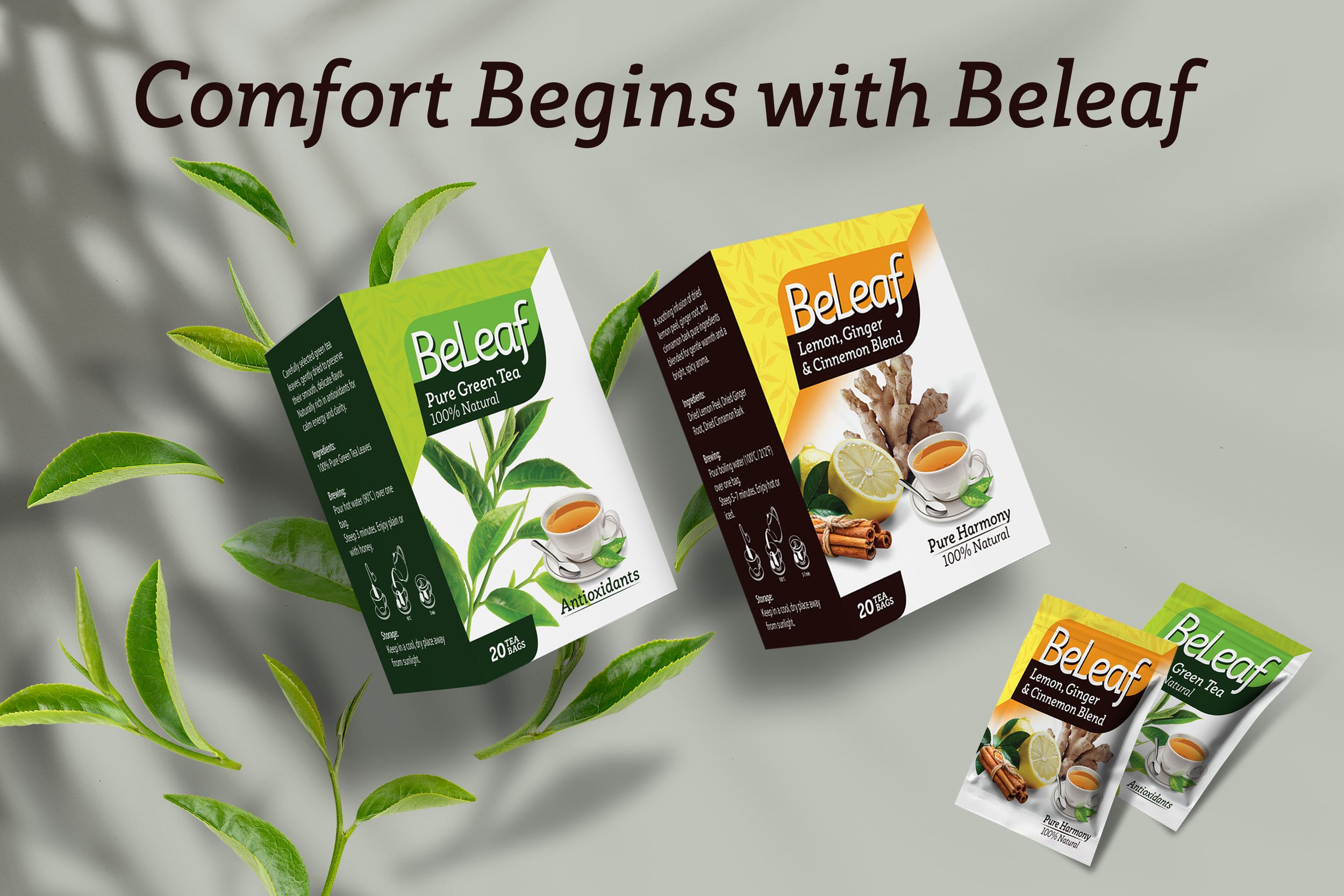 Beleaf is a tea brand centered on purity, balance, and natural wellness, expressed through both its ingredients and packaging design. The visual identity uses clean layouts, organic colors, and nature-inspired imagery to create a calm and refreshing feel. Green tones highlight freshness and vitality, while warm yellows and browns convey comfort and harmony. Minimal typography and a clear composition enhance the product’s natural essence, resulting in a cohesive design that reflects relaxation, energy, and mindful living.
